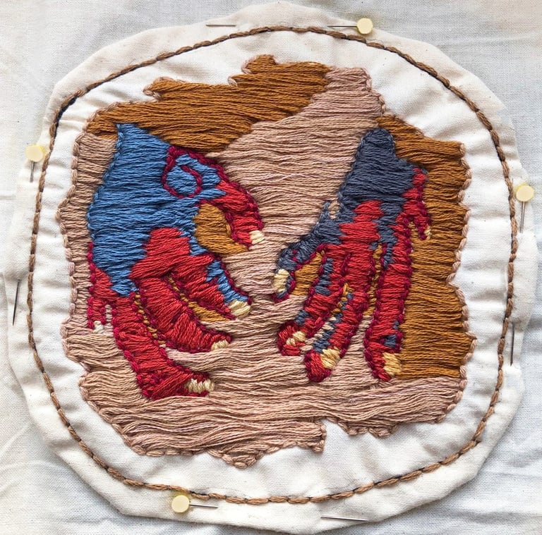 Hands patch, 2019. 6"x6.5". Hand embroidery on cotton.