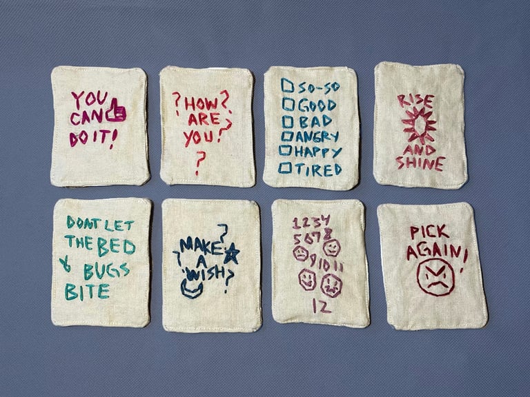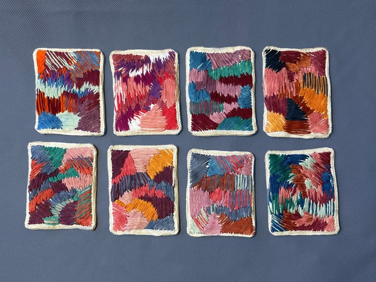 Pick Again! , 2021. 3"x4"/card. Hand embroidery on linen.